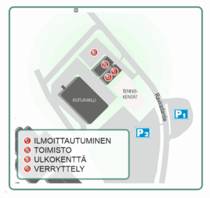Kilpailijoiden pysäköintialueet ovat ennen halleja Raviradantien varressa oikealla puolella oleva hiekkaparkki P1 ja vasemmalla puolella oleva asfalttiparkki P2. Ulkokentän jälkeen on iso hiekkaparkki, jonne voi myös pysäköidä. Tenniskenttien eteen, kadunvarteen tai kuplahallin viereen ei saa pysäköidä!